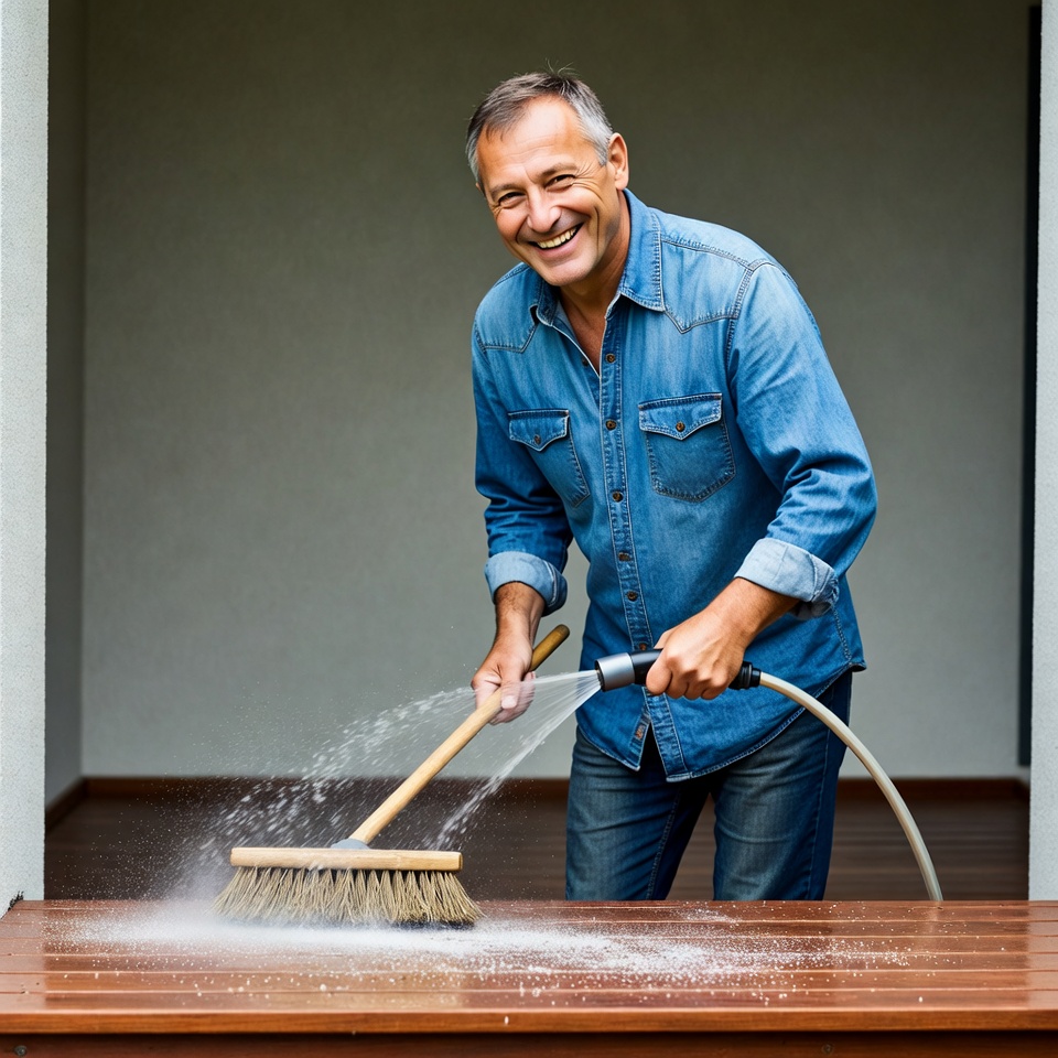 A middle-aged White man with short gray hair smiles while cleaning a wooden deck. He wears a blue denim shirt and jeans, holding a broom and spraying water from a green hose onto the soapy surface. The scene is set on a porch with a plain gray background.