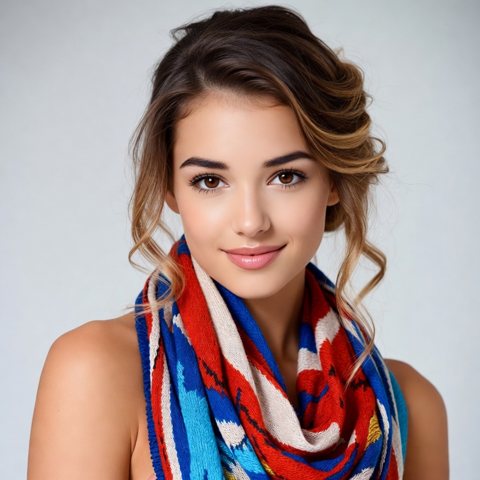 A young woman with long brown hair styled in an updo smiles at the camera against a white background. She wears a large multicolored scarf in red, blue, and white draped around her shoulders, revealing her bare shoulders. Her brown eyes and subtle makeup enhance her friendly expression.