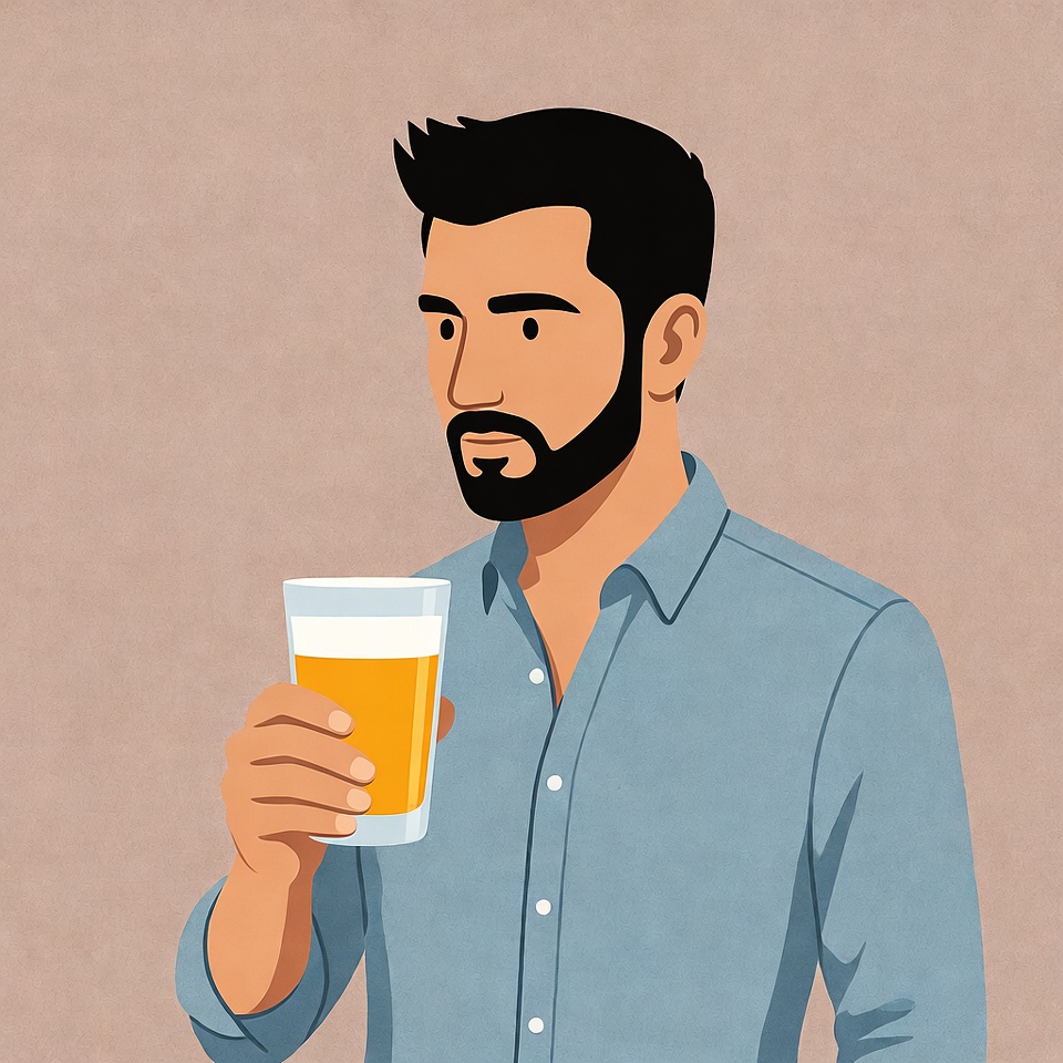 A cartoon man with short black hair and a beard holds a tall glass of beer. He wears a light blue button-up shirt with the top buttons undone. The illustration features a simple beige background.