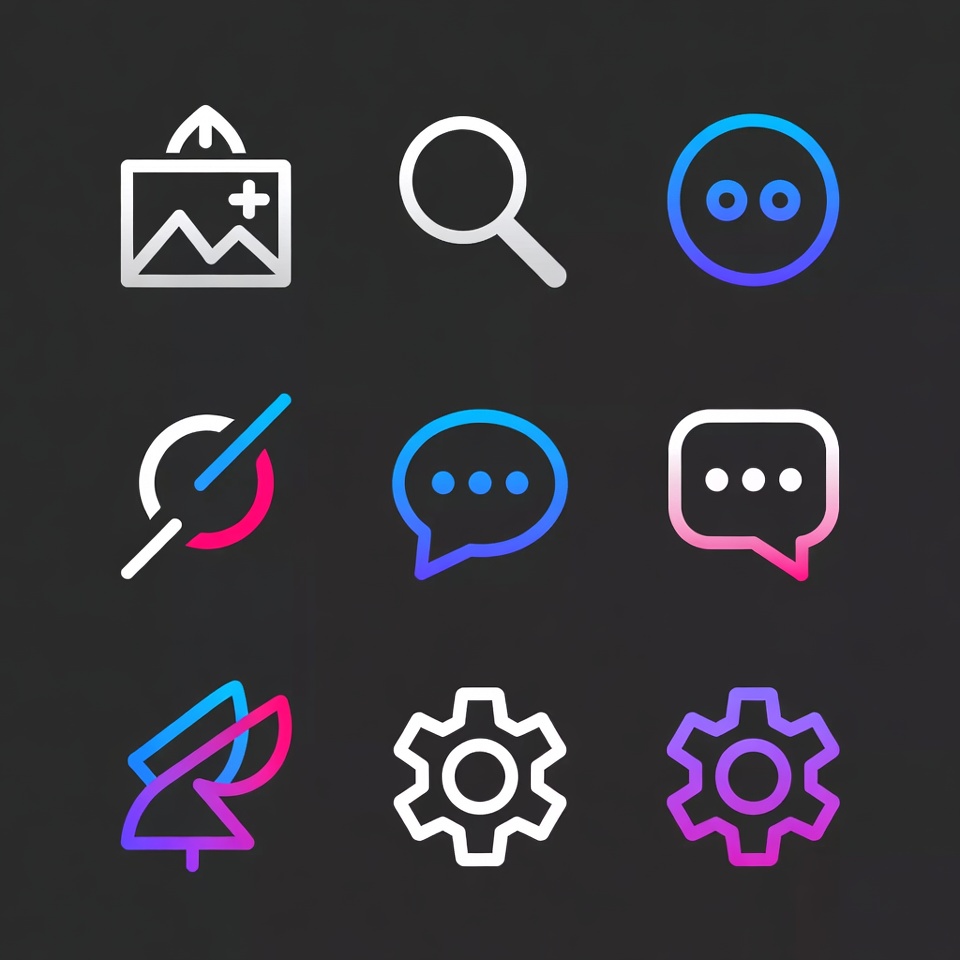app icons, arrow pointer, blue icons, chat bubble, cogwheel, colorful icons, digital icons, flat design, gradient icons, interface icons, isolated background, magnifier, message icon, more dots, pink icons, purple icons, search icon, settings gear, slider icon, upload icon, vector icons, web icons, UI icons