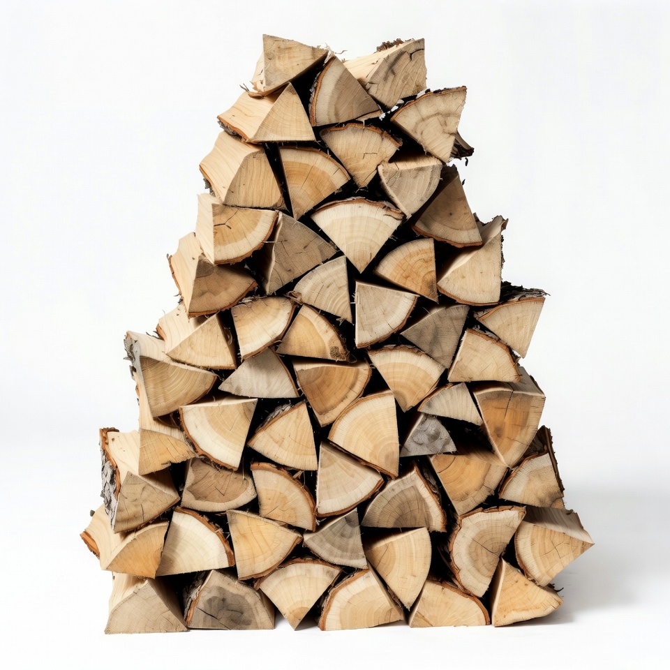 A tall stack of neatly arranged firewood logs forms a pyramid shape against a white background. The logs are cut into triangular cross-sections with light brown bark and pale wood interiors. The pile is dense and stable, isolated for clear visibility.