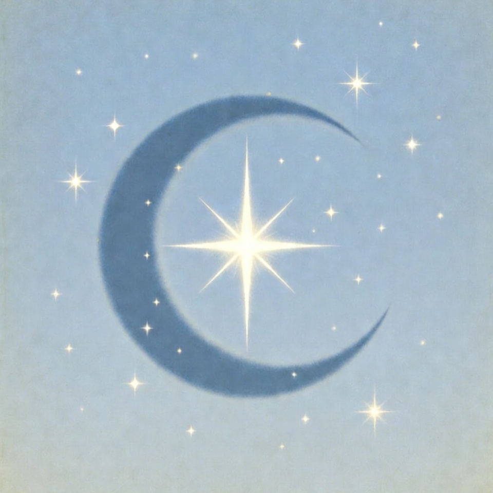 A glowing crescent moon silhouette centers on a soft blue background surrounded by twinkling stars. A bright star shines directly inside the moon's curve. The image features a vintage illustration style with subtle shading.