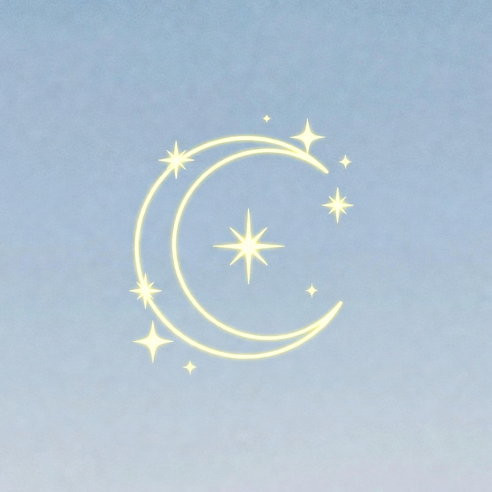 A glowing yellow crescent moon is centered on a light blue gradient background. Surrounding the moon are multiple bright yellow stars of varying sizes. The design features smooth neon outlines for a luminous effect.