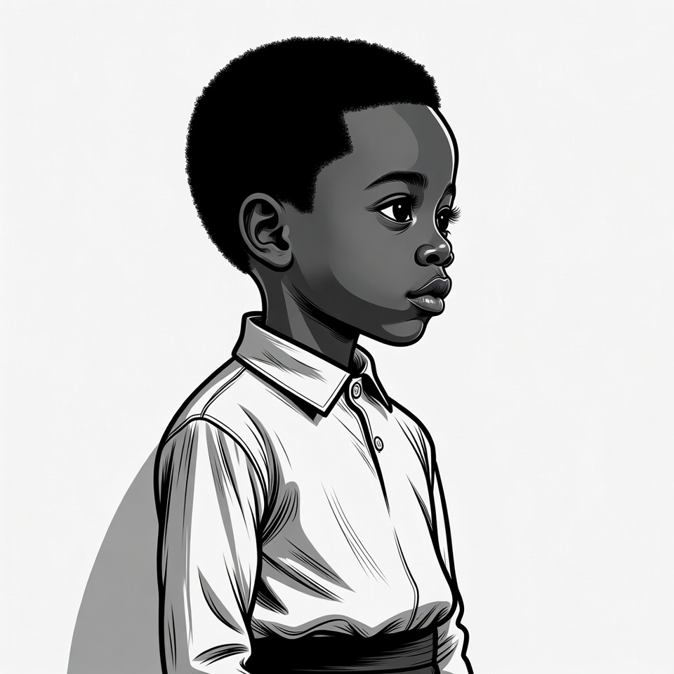 A black and white illustration depicts a young African boy in profile view against an isolated white background. He has short curly hair, large expressive eyes, and wears a collared long-sleeve shirt with a sash at the waist. A subtle shadow falls behind him, adding depth to the drawing.