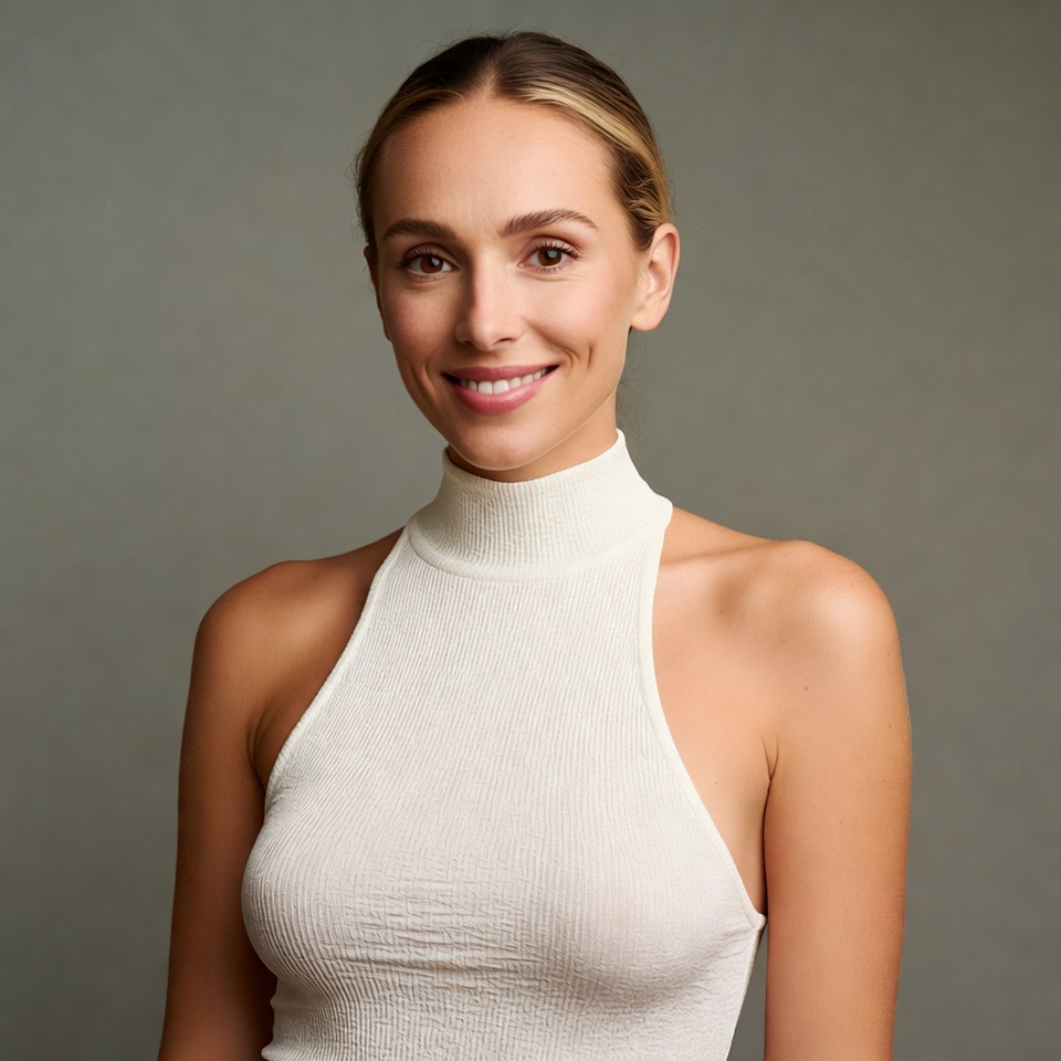 A young woman with blonde hair pulled back smiles at the camera against a gray background. She wears a sleeveless white turtleneck top with a textured fabric. Her shoulders are bare, and she has light makeup with pink lips.