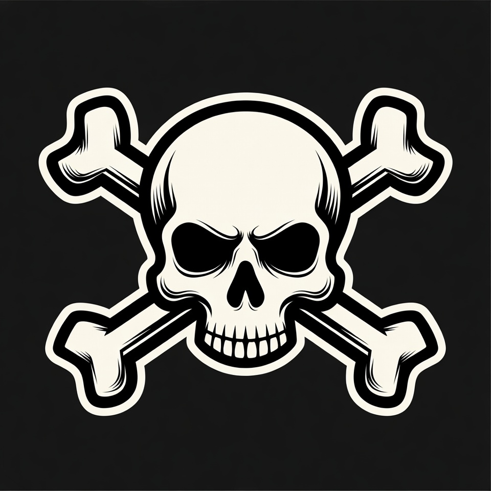 A bold white skull and crossed bones illustration on a black background. The skull features detailed outlines with glaring eye sockets and gritted teeth. It has a thick white border and edgy line art style.