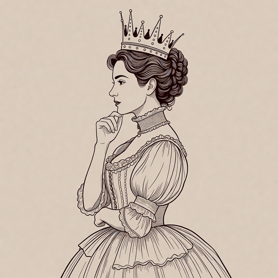 A detailed line art illustration depicts a woman in profile view wearing an ornate crown and Victorian-era gown with lace details and puffed sleeves. She has her brown hair styled in an elegant updo and rests her finger thoughtfully on her chin. The image features a beige background, emphasizing the intricate black ink drawing style.