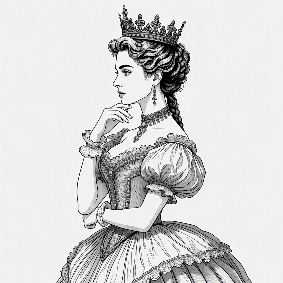 Victorian woman, White, black and white, corset, crown, earrings, elegant dress, female, gown, hand on chin, historical fashion, illustration, lace dress, line art, necklace, ornate jewelry, portrait, profile view, puffed sleeves, royalty, thoughtful pose, updo hairstyle, queen