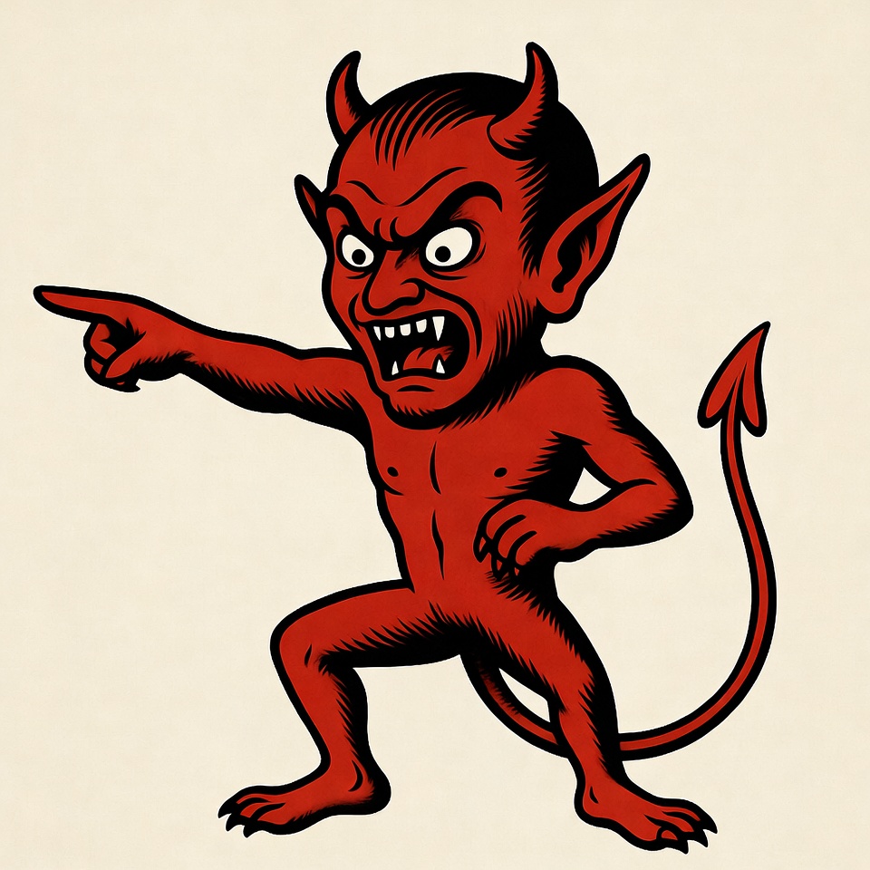 A red cartoon devil with horns, pointed ears, and a tail stands on clawed feet against a beige background. It has an angry expression with glaring eyes, bared fangs, and furrowed brows while pointing forward with one clawed hand and clenching the other fist.