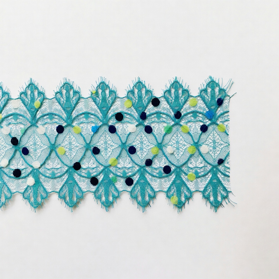A strip of intricate turquoise lace features delicate floral patterns and scalloped edges. It is adorned with small pom poms in turquoise, green, navy, and white. The lace is laid flat against a plain white background.