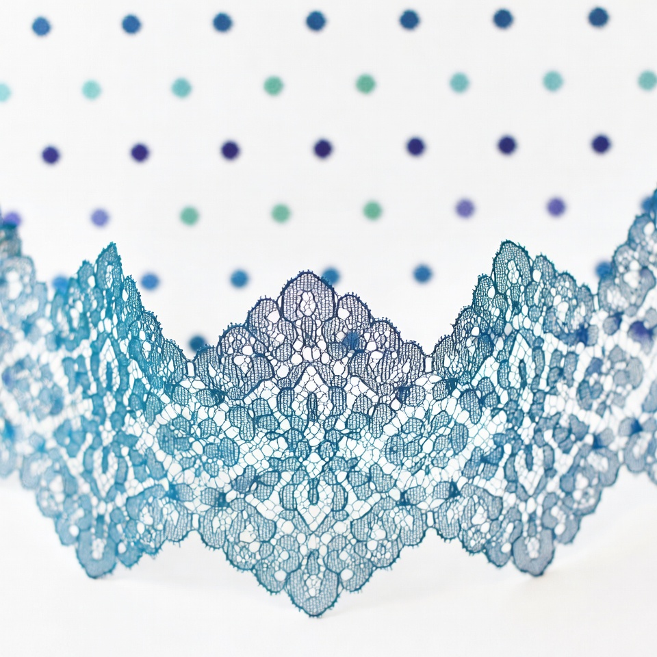 blue polka dots, craft lace, decorative lace, delicate lace, fabric, floral lace, isolated background, lace fabric, lace trim, lingerie trim, polka dots, scalloped lace, sewing trim, teal dots, textured fabric, trim, wavy lace, white background, blue lace