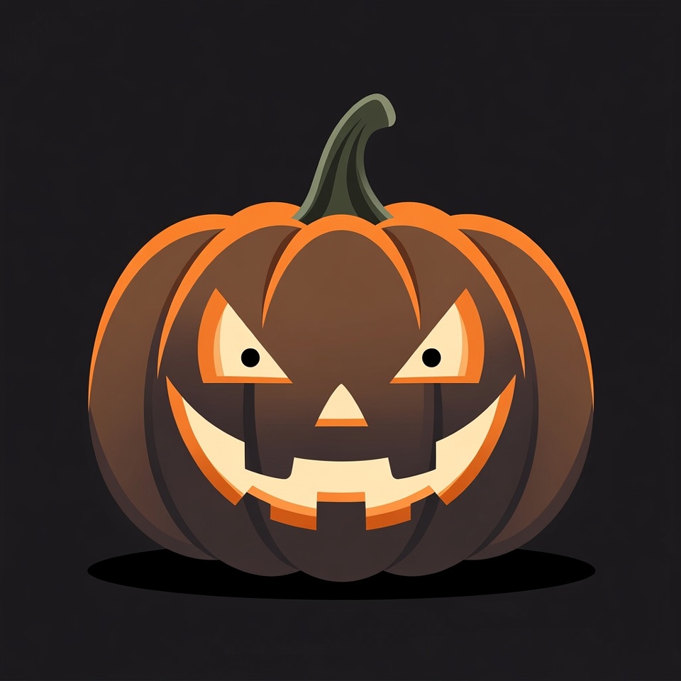 A cartoon jack-o'-lantern pumpkin with carved evil eyes, triangular nose, and wide jagged smiling mouth sits on a black background. The pumpkin features orange body with darker orange face details and a green stem on top. It has a subtle shadow beneath for a floating effect.