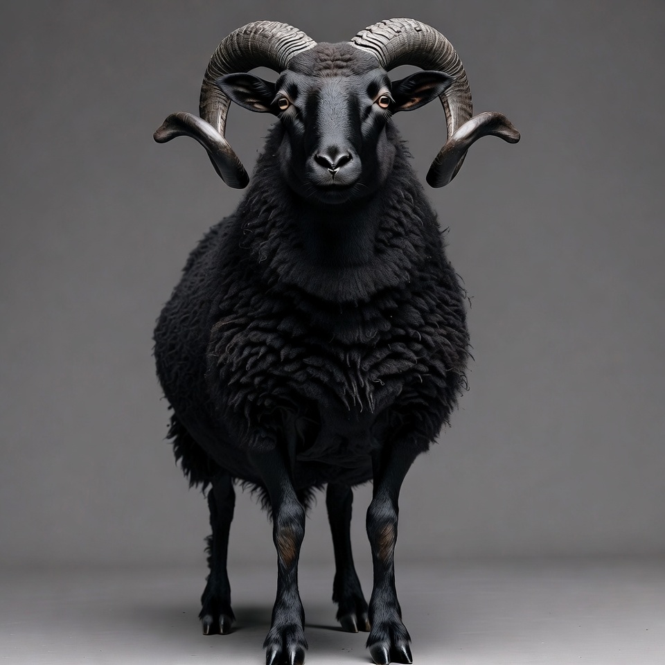 A black ram with thick curly wool stands on a plain gray background. It has large, curved black horns extending from both sides of its head. The ram faces forward with alert yellow eyes and a sturdy build.