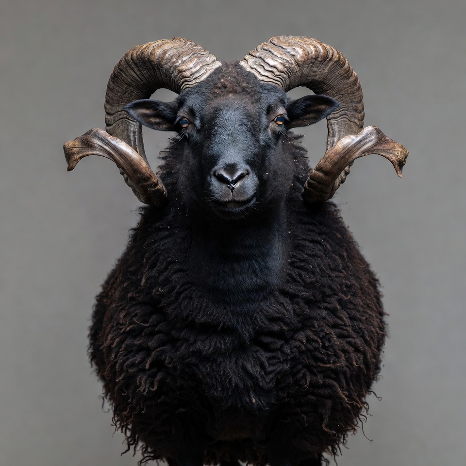 animal portrait, black sheep, curly horns, curved horns, dark wool, farm animal, gray background, headshot, isolated background, large horns, livestock, mammal, sheep, woolly sheep, ram