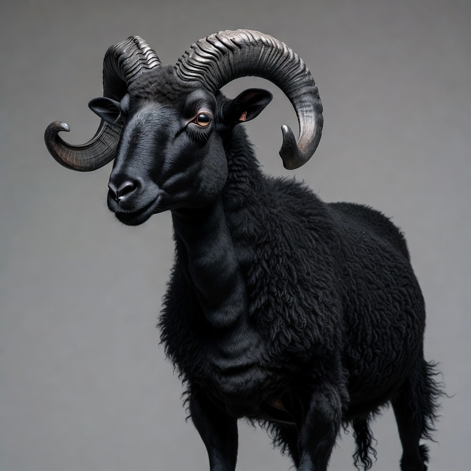 A majestic black ram stands on a plain gray background. It has thick black wool, large curved black horns spiraling outward, and dark eyes. The ram faces forward with a direct gaze.
