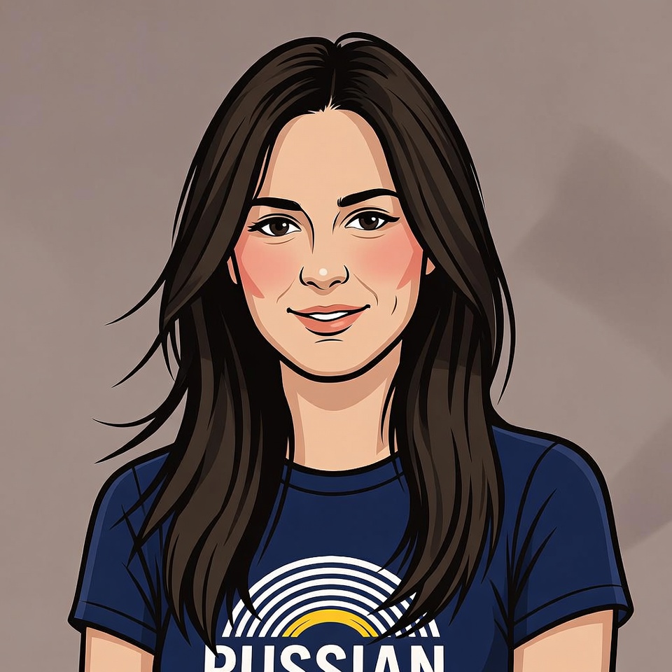 A young woman with long wavy dark brown hair smiles at the viewer against a plain gray background. She has fair skin, rosy cheeks, and wears a navy blue t-shirt featuring a white rainbow design and 'Russian' text. The image is a colorful digital illustration or clipart portrait.