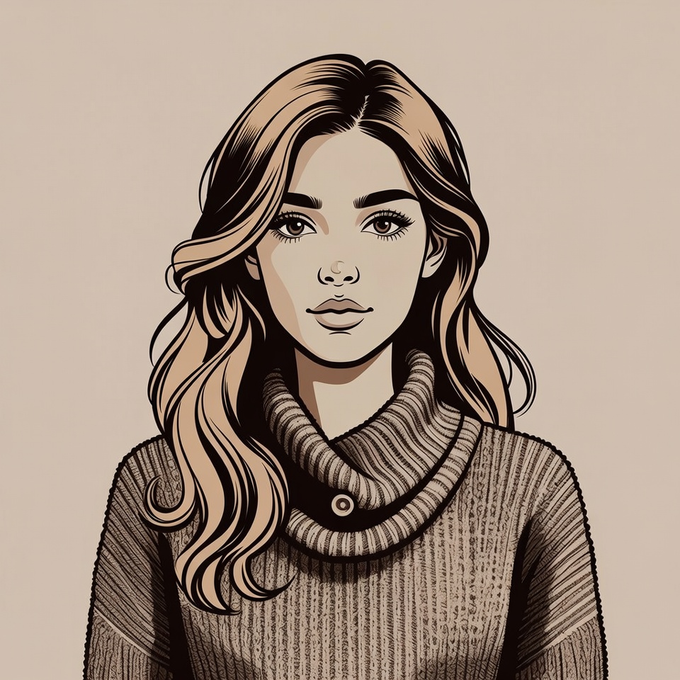 beautiful woman, beige background, blonde hair, brown sweater, digital illustration, face, fashion illustration, female, illustration, isolated background, line art, long hair, portrait, stylish woman, turtleneck sweater, wavy hair, young woman, woman
