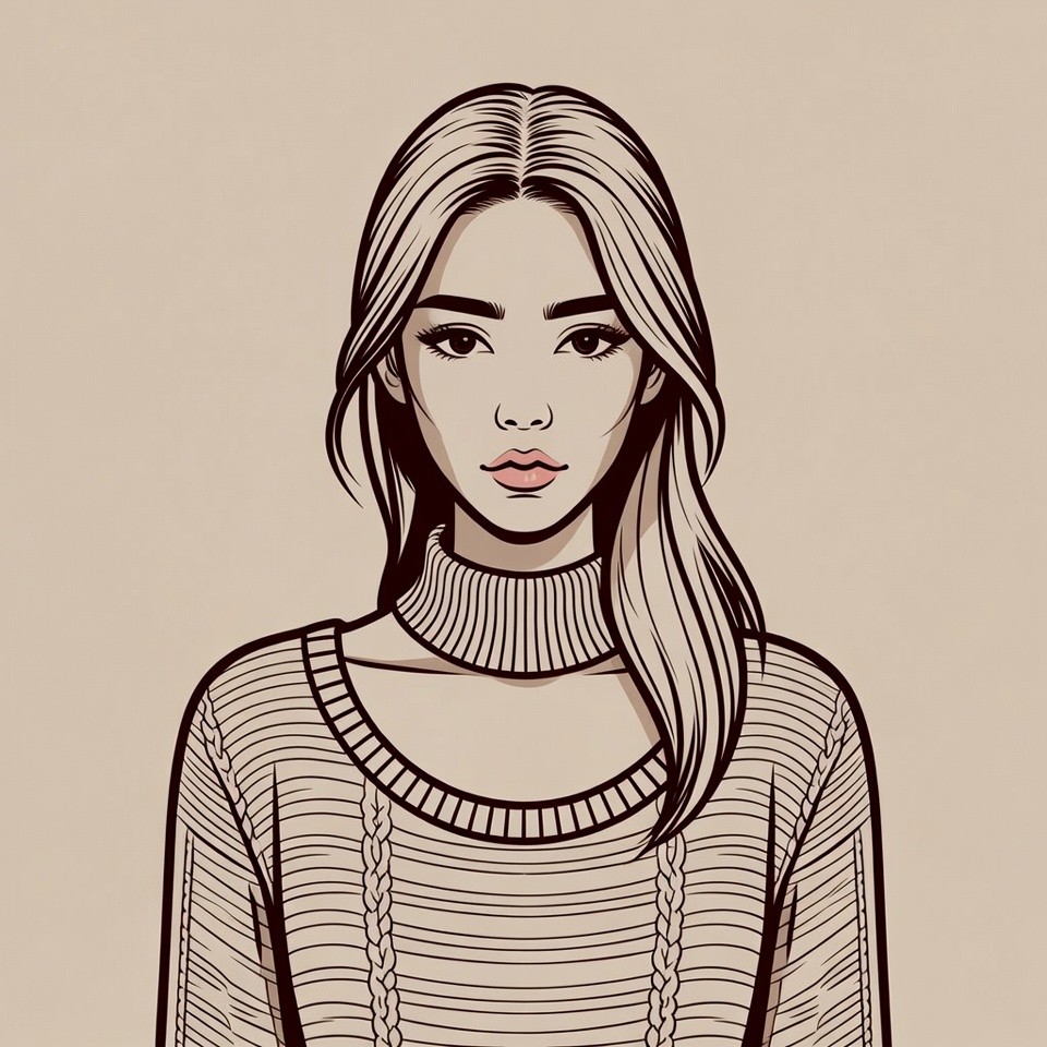 Asian, avatar, beige clothing, blonde hair, cable knit, clipart, drawing, fashion, female, illustration, isolated background, knitwear, line art, long hair, portrait, side hair, simple background, stylish, sweater, turtleneck, young woman, woman