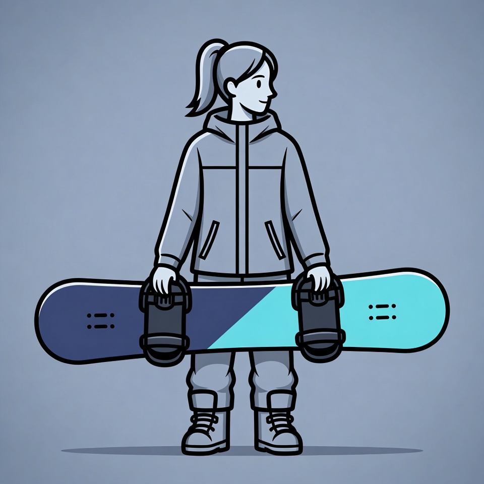 A cartoon woman with a ponytail stands holding a snowboard with blue and teal sections and black bindings. She wears a hooded jacket, pants, and boots in gray tones. The illustration features a simple isolated background.