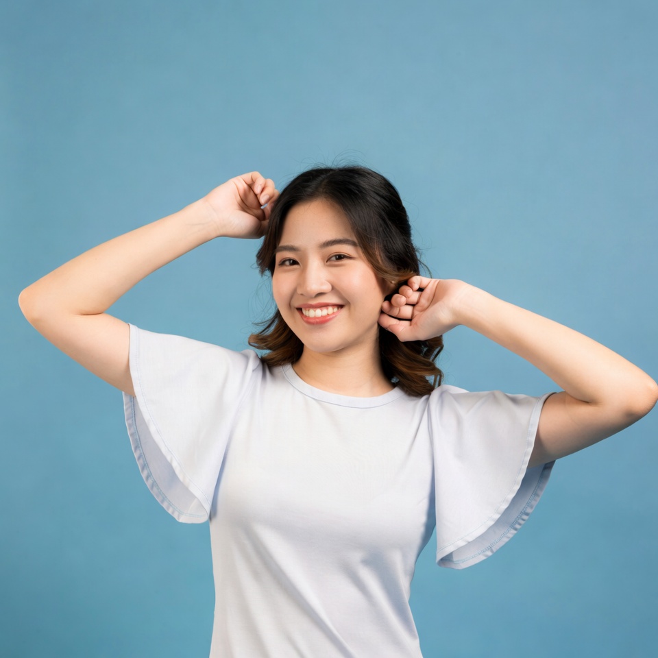 A young Asian woman with shoulder-length dark hair smiles happily while stretching both arms raised high above her head. She wears a loose white blouse with flared sleeves. The image is set against a solid blue background.