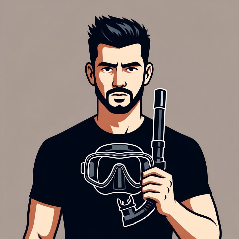 A young man with short dark hair and a beard stands confidently against a plain background. He wears a black t-shirt and holds black snorkeling goggles and a snorkel in his hands. The image is a bold vector illustration.