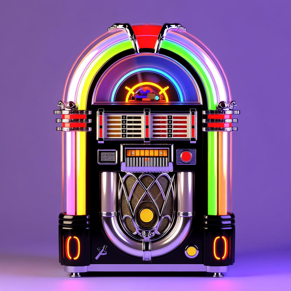 3D render, 80s jukebox, arcade machine, chrome jukebox, classic jukebox, colorful lights, digital art, glowing jukebox, illuminated buttons, isolated background, music machine, neon lights, purple background, rainbow neon, record player, retro jukebox, speaker grille, vintage jukebox, jukebox
