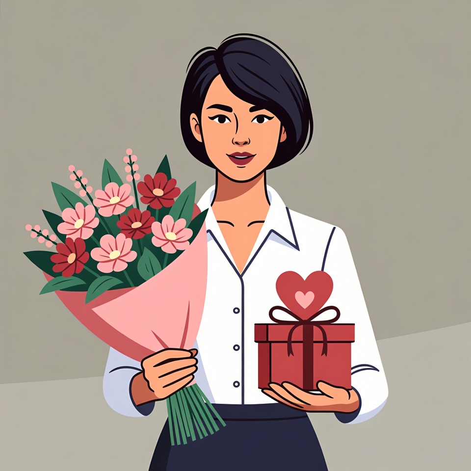 An Asian woman with short black hair and a subtle smile holds a large bouquet of pink and red flowers wrapped in pink paper. She wears a white collared shirt and black skirt while also holding a red gift box topped with a pink bow and heart. The illustration features a plain background.