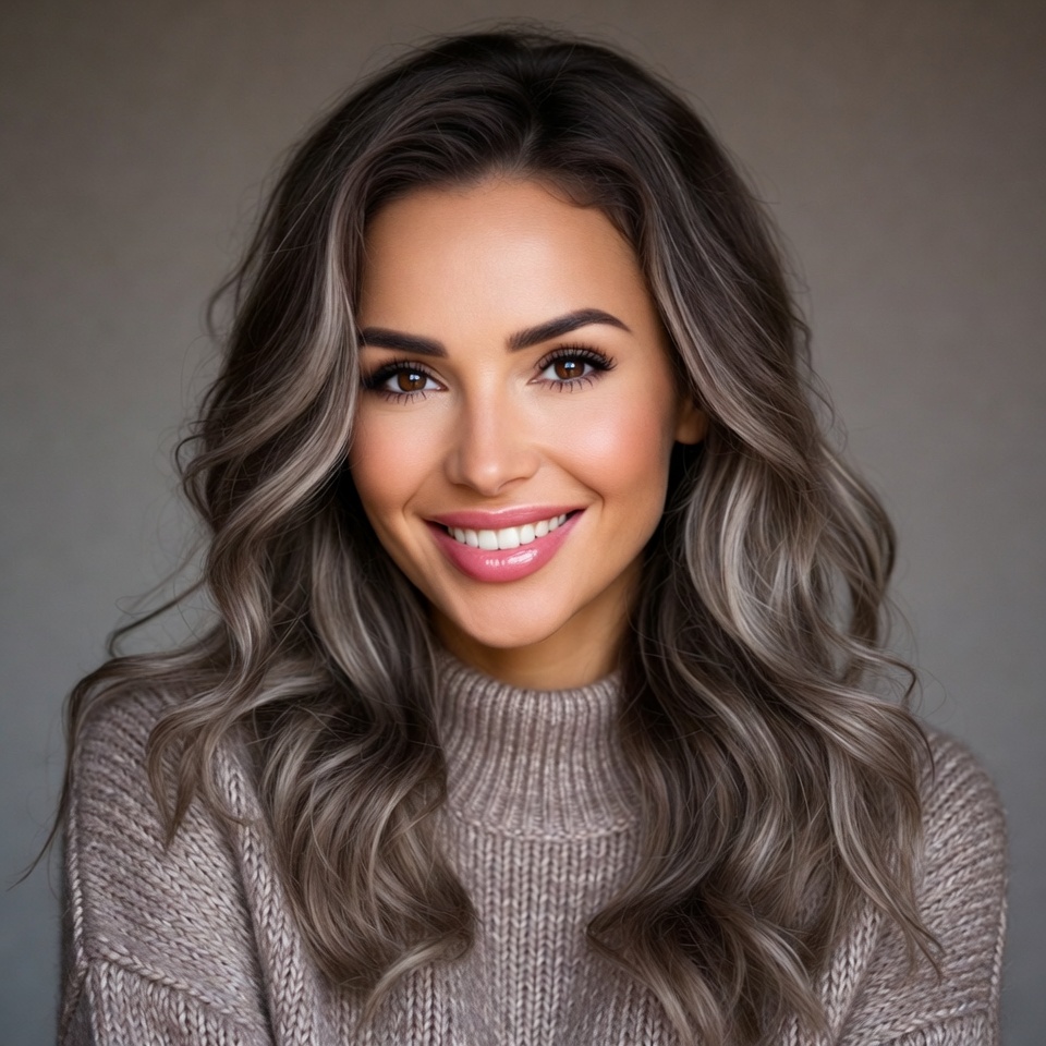 A young woman with long wavy balayage hair in light brown and blonde tones smiles warmly at the camera. She has defined eyebrows, rosy cheeks, and glossy pink lips. She wears a cozy light gray turtleneck sweater against a plain gray background.