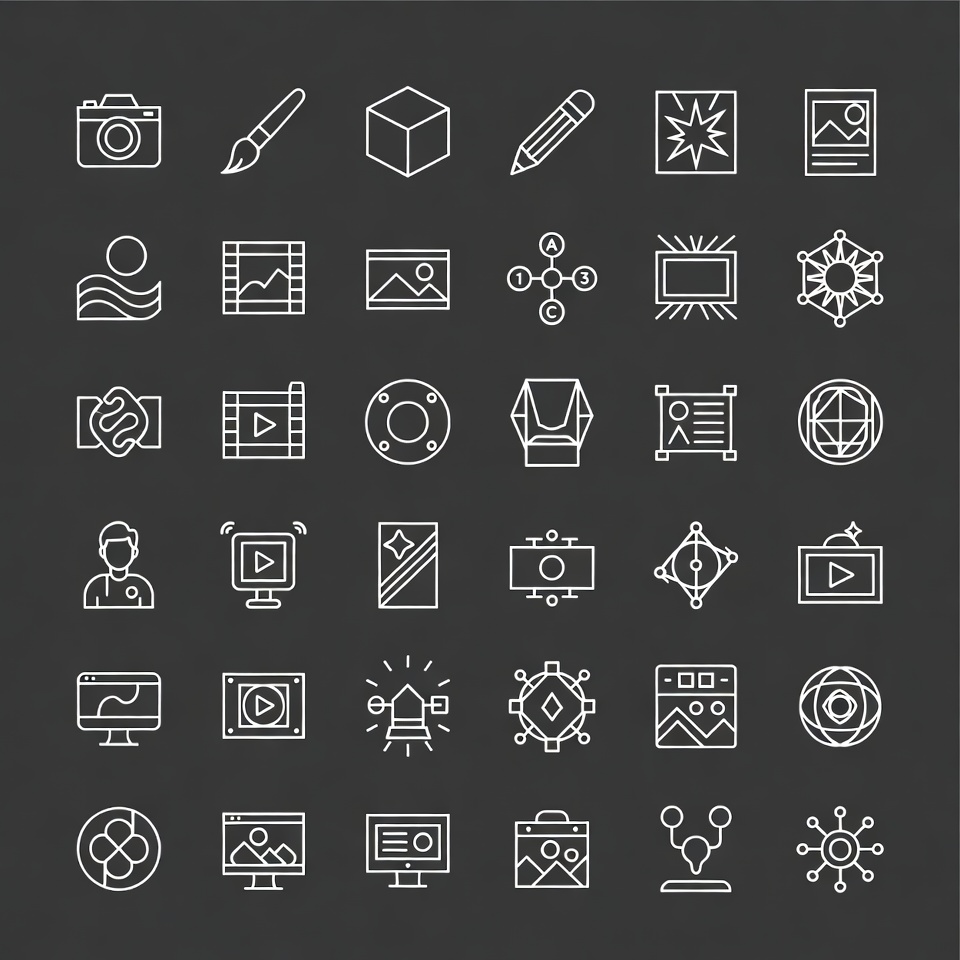 A collection of 36 white line icons on a dark gray background represents graphic design and multimedia elements. Icons include camera, paintbrush, 3D cube, pencil, wave, film reel, monitor, shapes, and network symbols. The icons are uniformly styled in outline format for design use.