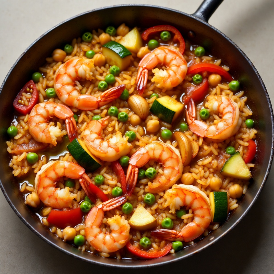 A black cast iron pan holds a vibrant shrimp paella topped with large pink shrimp. The rice is mixed with chickpeas, green peas, sliced zucchini, red bell peppers, and tomatoes. The dish is presented on a plain light background.
