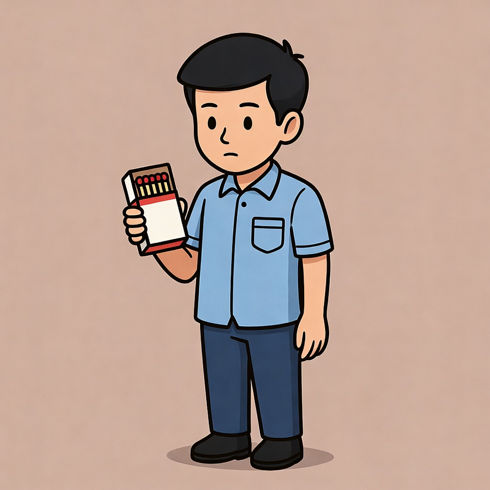 A cartoon Asian boy with short black hair stands on a beige background holding a white matchbox in his right hand. He wears a light blue short-sleeve button-up shirt with pockets and dark blue pants. His expression is slightly concerned as he presents the matchbox forward.