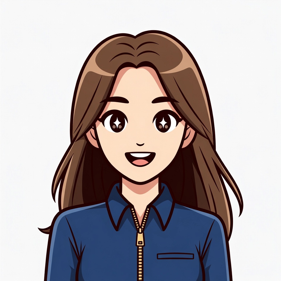 A cute anime girl with long brown hair and large sparkling eyes smiles happily. She wears a blue collared jacket with a zipper. The illustration is on a white isolated background.