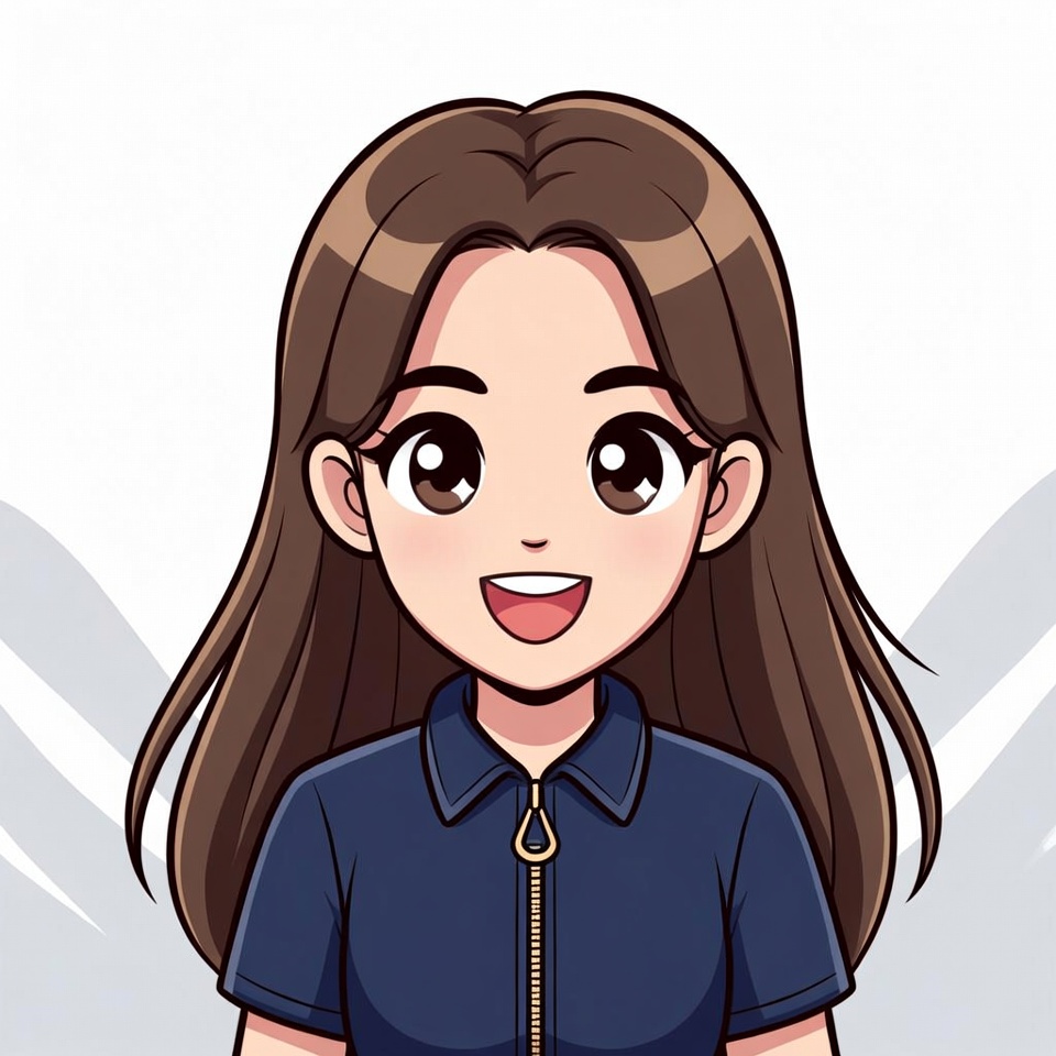 A cute anime girl with long brown hair and large sparkling eyes smiles happily. She wears a navy blue collared jacket with a zipper. The illustration features her against a plain white background with subtle gray accents.