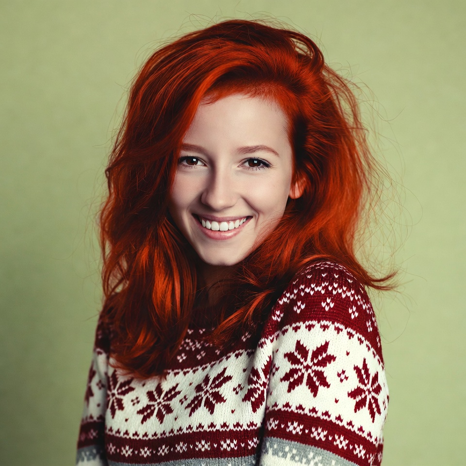 A young woman with long wavy red hair smiles at the camera against a light green background. She wears a festive red and white knitted sweater with snowflake patterns. Her fair skin and bright eyes are highlighted in the close-up portrait.