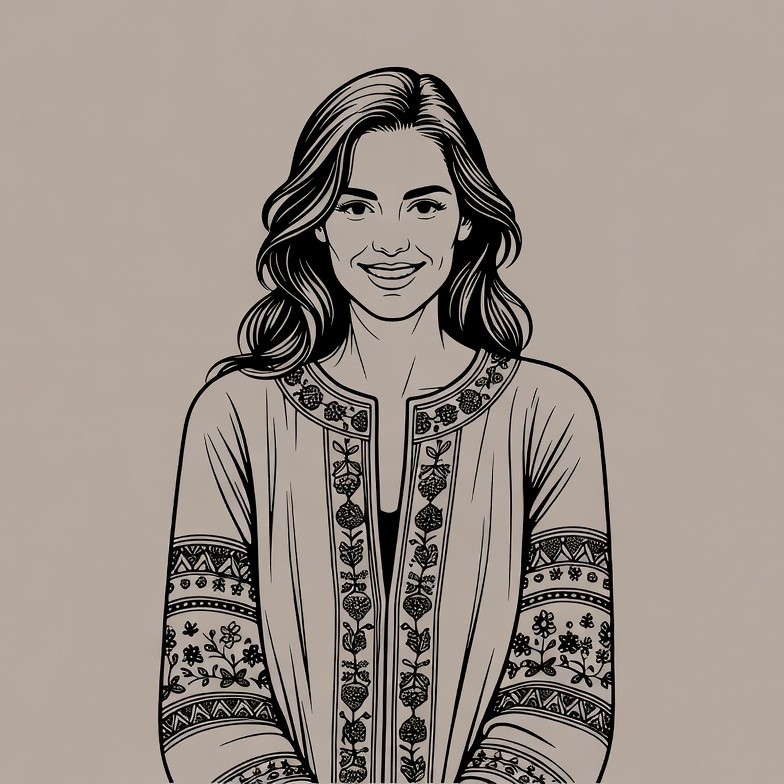 Line art illustration of a smiling woman with long wavy hair facing forward. She wears a loose-fitting blouse with intricate floral embroidery on the collar, front, and sleeves over a dark top. The design features a clean, isolated beige background.