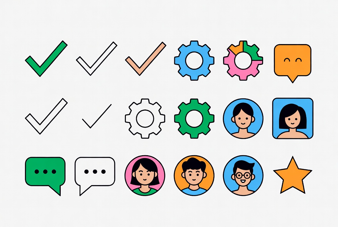A collection of colorful flat icons arranged in a grid on a white background. Icons include green and white checkmarks, various colored gears, speech bubbles, stars, and circular avatar faces of women and men with diverse hairstyles and glasses. The icons feature bold outlines and vibrant colors like pink, orange, green, and blue.