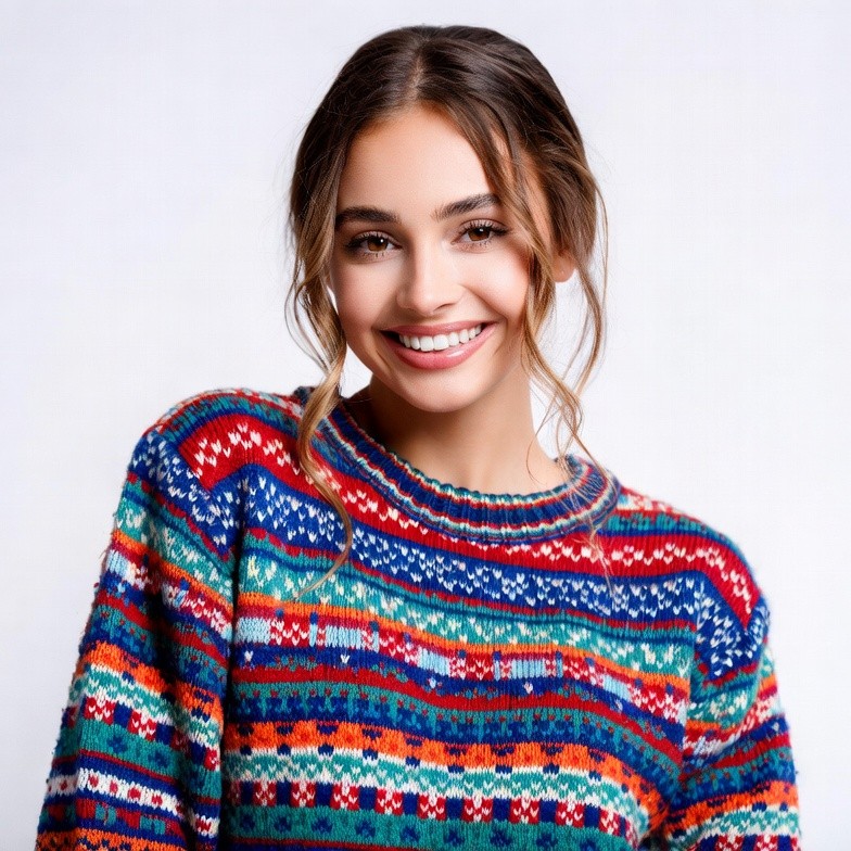 A young woman with long brown hair styled in a loose ponytail smiles warmly at the camera. She wears a vibrant multicolored knit sweater with intricate Nordic patterns in red, blue, green, and white. She stands against a plain white background.