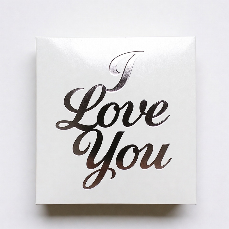 I Love You, Valentine's Day, cursive font, elegant lettering, gift box, isolated background, love text, metallic letters, romantic message, shiny text, silver foil, square box, white box