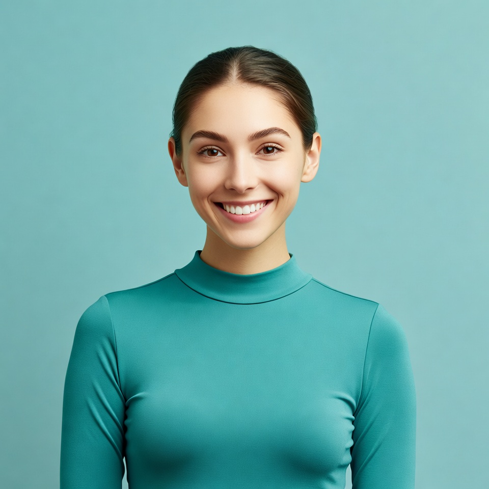 A young woman with dark hair pulled into a bun smiles warmly at the camera. She wears a form-fitting turquoise turtleneck sweater. The image features a solid light blue background.