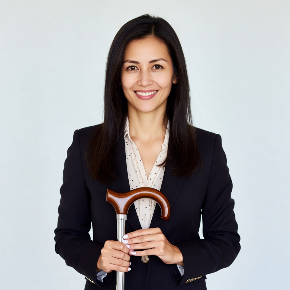 A smiling Asian woman with long straight black hair stands against a white background, holding a wooden cane with both hands. She wears a black blazer suit with a white blouse underneath. Her expression is friendly and confident.