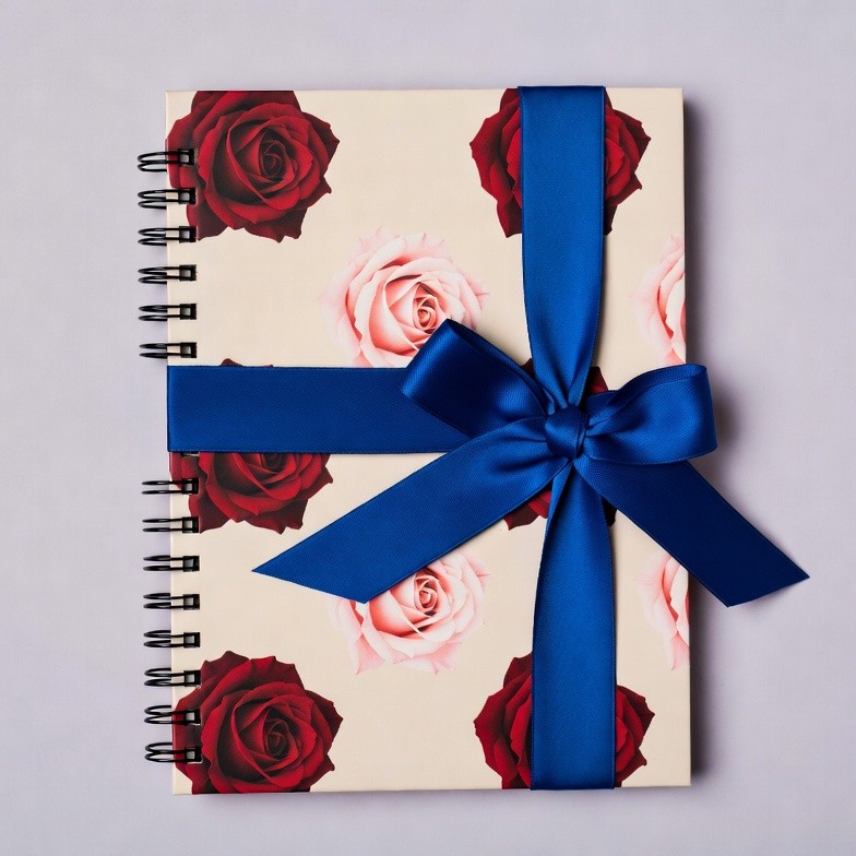 blue ribbon, cream cover, floral design, gift, isolated background, journal, pink roses, red roses, rose pattern, satin bow, spiral bound, wrapped notebook, notebook