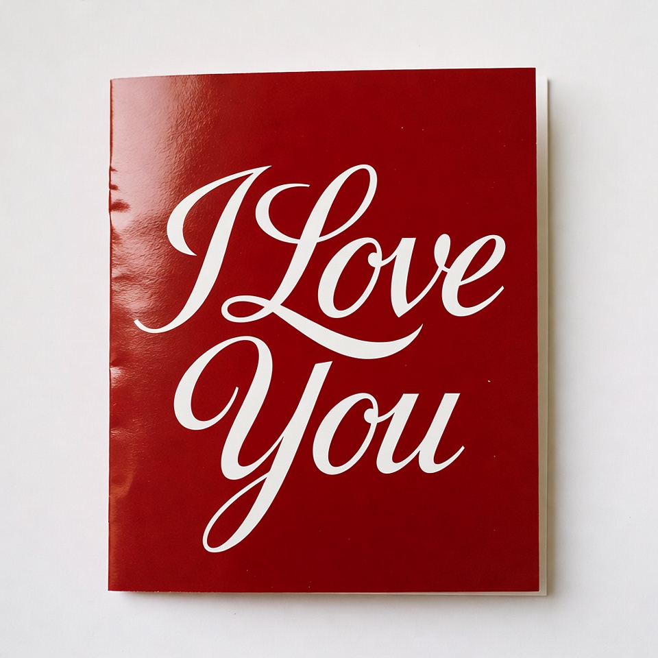 cursive font, glossy card, greeting card, isolated background, love card, red card, romantic card, valentine card, white text, I love you