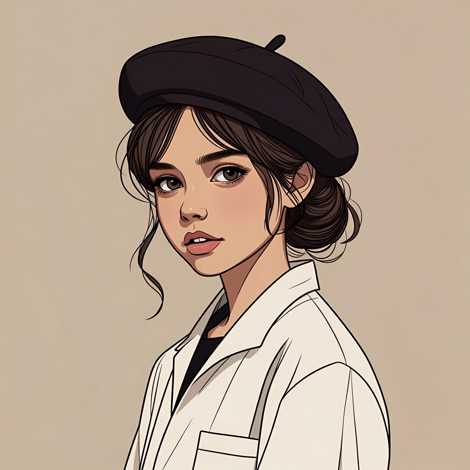 A young woman with brown hair styled in a loose bun and loose strands faces slightly to the side. She wears a black beret tilted on her head and a white collared shirt. The digital illustration features her on a beige background with expressive eyes and subtle makeup.