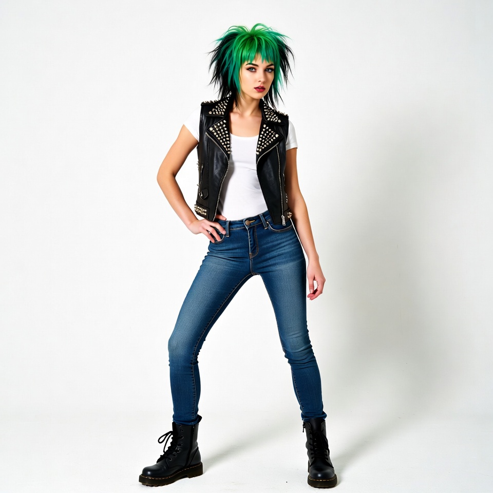 A young woman with a vibrant green spiked punk hairstyle stands confidently on a white background. She wears a black studded leather vest over a white tank top, blue skinny jeans, and black combat boots. Her pose features one hand on her hip and a direct gaze at the camera.