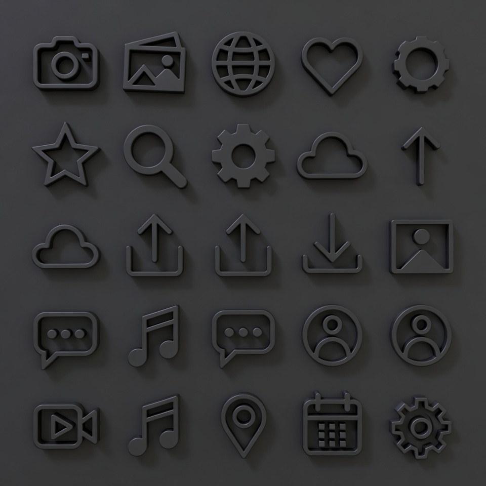 app icons, arrow icon, calendar icon, camera icon, cloud icon, dark background, download icon, gear icon, globe icon, glossy icons, gray icons, heart icon, icon set, location pin, magnifying glass, message icon, metallic icons, music note, photo icon, play button, star icon, symbol collection, upload icon, user profile, 3D icons