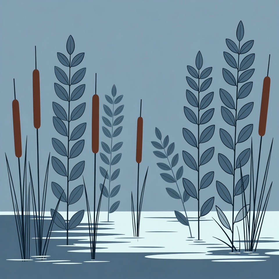 A minimalist illustration depicts tall reeds and cattails growing in shallow water. The plants feature brown seed heads and green leaves against a gray background. Simple vector lines create a serene wetland scene.