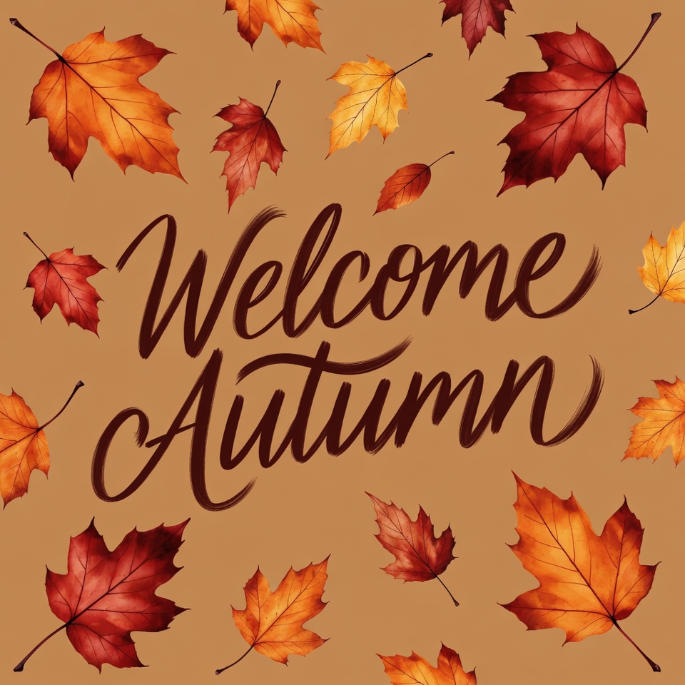 An illustration features elegant cursive text reading 'Welcome Autumn' centered on a beige background. Vibrant orange, red, and yellow autumn leaves are scattered and falling around the text. The design has a festive fall theme with detailed leaf illustrations.