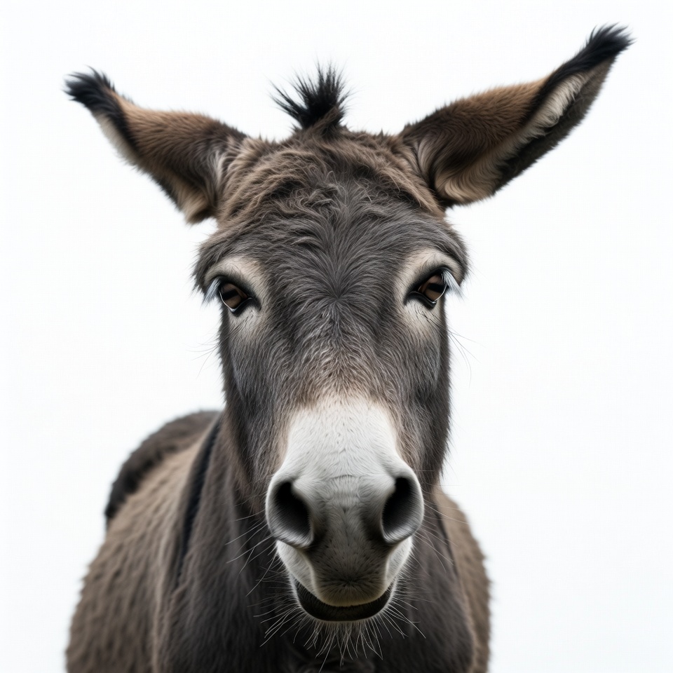 A brown donkey with long ears and a fluffy mane stares directly at the camera. Its muzzle is white with dark nostrils, and it stands against a plain white background. The close-up portrait highlights the donkey's expressive eyes and soft fur.