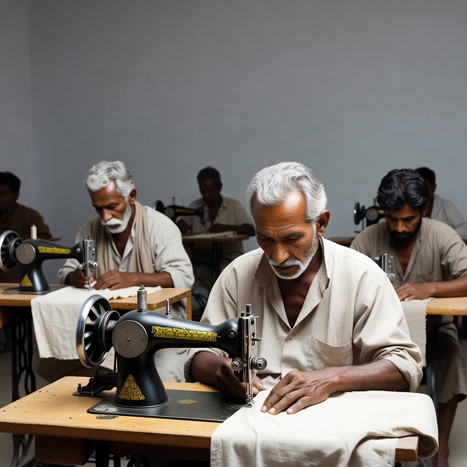 Several elderly Indian men with white hair and mustaches sit at sewing machines in a brightly lit classroom. They wear beige kurtas and dhotis while operating black Singer sewing machines on wooden tables with fabric. The group focuses on stitching garments at their workstations.