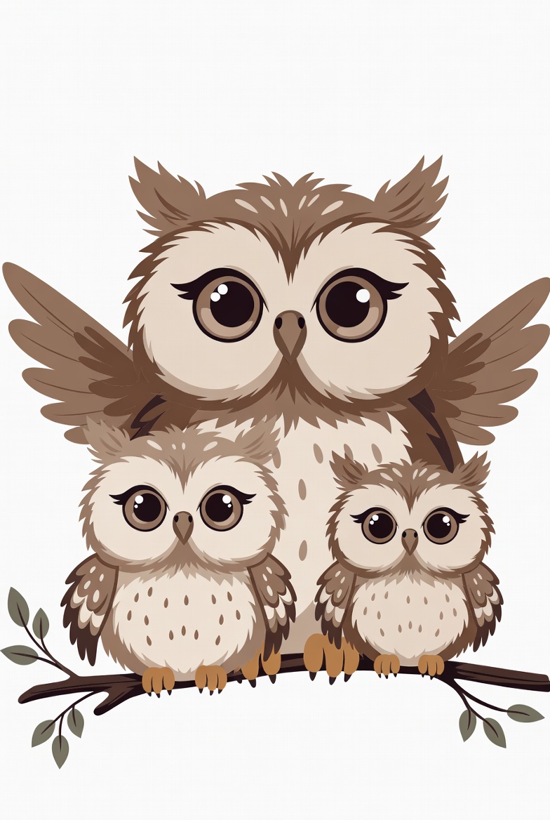 animals, baby owls, big eyes, bird illustration, brown owl, cartoon owl, clipart, cute owls, fluffy feathers, green leaves, isolated background, mother owl, owls family, perched on branch, wings spread, owl